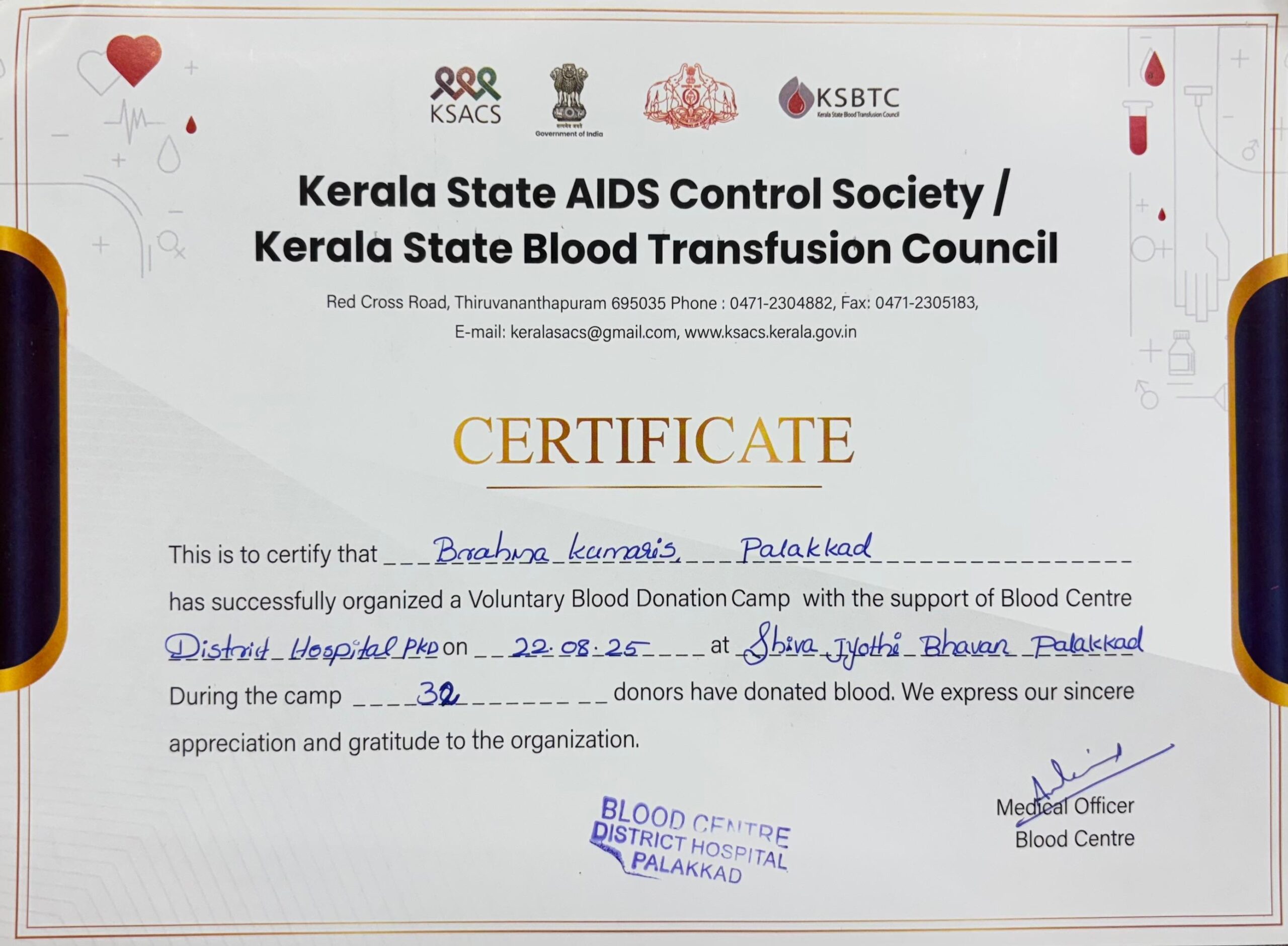 ബ്രഹ്മാകുമാരിസ് മുൻ മുഖ്യ പ്രശാസിക ദാദി പ്രകാശ് മണി ജി യുടെ സമരണാർത്ഥം വിശ്വ സാഹോദര്യ സന്ദേശ പ്രചരണം എന്ന ലക്ഷ്യവുമായി അഖിലേന്ത്യാ തലത്തിൽ ആഗസ്റ് 22 മുതൽ 25 വരെ സംഘടിപ്പിച്ചിരിക്കുന്ന മഹാ രക്തദാന ക്യാമ്പയിൻറെ ഭാഗമായി പാലക്കാട് ബ്രഹ്മാകുമാരിസ് ആസ്ഥാന കേന്ദ്രമായ ശിവജ്യോതിഭവനത്തിൽ വെച്ച് പാലക്കാട് ജില്ലാ ആശുപത്രിയുടെ സഹകരണത്തോടെ മഹാ രക്ത ദാന ക്യാമ്പയിൻ ഓഗസ്റ്റ് 22 ന് നടന്നു.