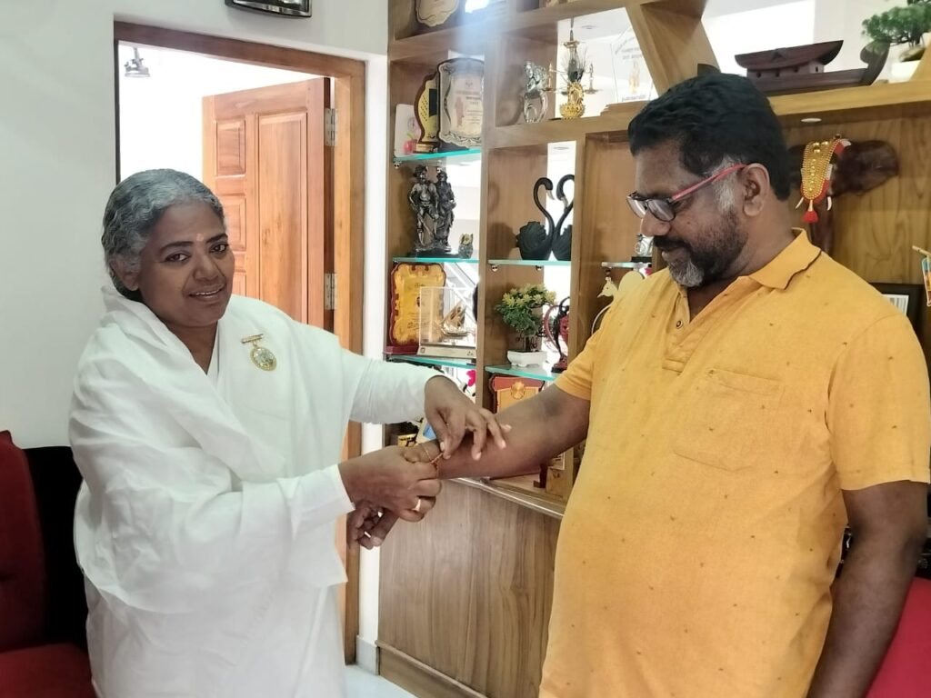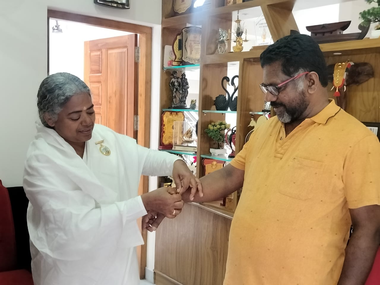 BK Disha Behn tying Rakhi to Agricultural minister P. Prasad on the occasion of Raksha Bandhan